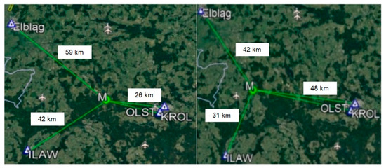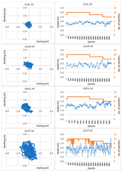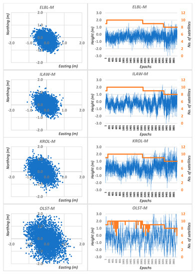 Four thousand consecutive epochs were recorded on each point. For each measurement session, independent DGPS calculations were made for the M mobile receiver using the four closest reference stations located around the observation point. Therefore, four independent DGPS solutions based on the least squares method (LS) were obtained for each session: ELBL-M; ILAW-M; KROL-M and OLST-M (Figure 2). In addition, the Kalman filter (KF) was used for each solution (Figure 3).