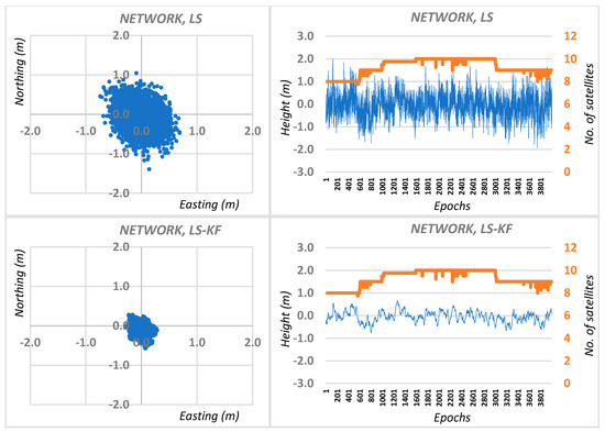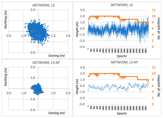 Identical calculations were made for session II, where the observation point was at different locations and at a different observation time. The graphic results of network positioning for session II are shown in Figure 5, while the average RMS errors are presented in Table 2. Similar RMS errors were obtained for both session I and session II, i.e., for coordinate N the average DGMS network positioning RMS error was 0.232 and 0.217 m, for the E coordinate was 0.313 and 0.304 m, respectively, and for the heights 0.562 and 0.523 m. In the case of additional Kalman filtering, the average RMS errors were reduced by approximately 50%, and were as follows: for coordinate N: 0.131 and 0.100 m; for coordinate E, 0.167 and 0.135 m, and for coordinate H: 0.299 and 0.241 m.