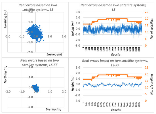 Therefore, having two independent observation sessions, we carried out computational simulations, using real errors of DGPS network positioning for two GNSS systems and for four GNSS systems, including the results of DGPS network positioning for sessions I and II. Graphical results of this solution are shown in Figure 6 and Figure 7, respectively, for two and four GNSS systems. Based on Figure 6 and Figure 7, we can see a significant accuracy improvement in relation to traditional DGPS positioning. When using a Kalman filter for the DGNSS network positioning case using two independent positioning systems, the average RMS errors were 0.08, 0.11 and 0.19 m for the N, E, H coordinates, respectively. In the case of the simulation for four DGNSS network positioning systems, the average errors were 0.04, 0.06 and 0.12 m, respectively, for N, E, H coordinates.
