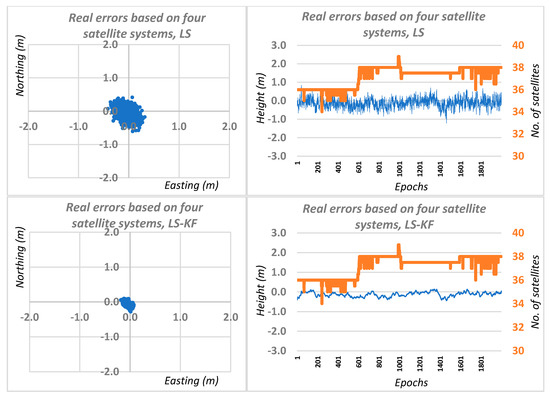 Real errors of the simulated network DGNSS positioning based on least squares solutions and Kalman filtering for four GNSS systems.