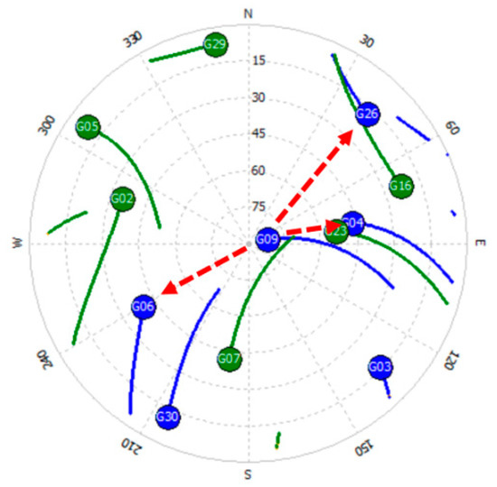 The analysis of such a strategy was tested for real GPS data, for a 4 km baseline. The tests used GPS observations carried out on 22 January 2020 [35], for a ten minute session with an interval of 1 s. The satellite situation during the measurements is shown in Figure 8. The analyses were performed using observations from four GPS satellites: G04, G06, G09 and G26, for which code and phase measurements were recorded at the frequencies L1 = 1575.42 MHz and L5 = 1176.45 MHz. Solutions of float ambiguities, determined only for single DD observations from two satellites, based on Formulas (12) and (13) are shown in Figure 9 and Figure 10. Additionally, these figures show the sets of the most probable ambiguities N1–N5 depending on the assumed relative errors of the L1 and L5 phase observations, using the function used in the PREFMAR method and expressed by Formula (11).
