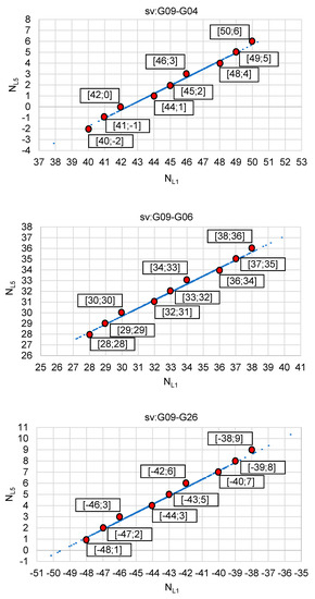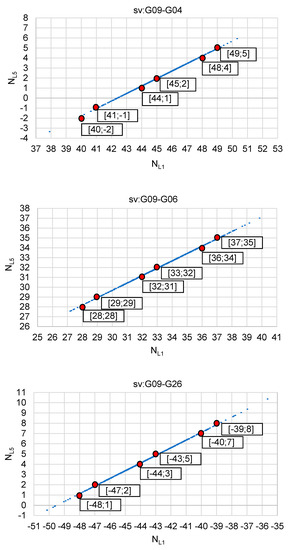 Figure 9 shows possible ambiguities for DD observations and satellite pairs: G09–G04, G09–G06, G09–G26, assuming that the relative errors of phase observations do not exceed 10 cm. It is therefore quite a large value, suitable for baselines with a length of even several or several dozen kilometers, depending on the observation conditions, i.e., depending on the activity of the ionosphere or depending on the position of the satellites above the horizon. In the case of the use of the three reference stations available, there is no need to determine long baselines between the mobile receiver and any of these reference stations. We only determine the baseline with respect to the virtual reference station. As is known, a reference station can be created at any position, e.g., at a distance of several meters, with respect to our 3D position. In such cases, we can therefore assume that the relative errors of phase observations do not exceed, for example, 7 cm. This immediately results in a reduction of the number of possible ambiguity sets that can potentially be searched unknowns (Figure 10). Thus, for relative errors smaller than 7 cm, based on the P (L5) code observations only, we have for each pair of satellites six ambiguity pairs for validation, which for three DD observations gives 63 = 216 combinations. Therefore, quite a lot of combinations as for RTK measurements. However, if we increase the accuracy of DD code observations to 0.47 m, we will reduce the number of potential ambiguities to three sets for each pair of satellites, and this for relative errors up to 7 cm. Thus, for three independent DD observations, we get 33 = 27. If we increase even more the accuracy of the code measurements to 0.38 m, then for relative errors less than 7 cm, we get only 23 = 8 combinations for four satellites. Such a small number of combinations will significantly reduce the initialization time of the determined ambiguities. It should also be noted that for code errors below 0.38 cm and for relative errors of phase observations below 3 cm, we are able to unambiguously determine the searching ambiguity sets for a given DD observation [34]. In practice, for RTK measurements, we should safely use the range (−7 cm; +7 cm), which should be sufficient for RTK positioning using virtual reference stations, or for baselines in fast static measurements, with lengths of about a few kilometers. Furthermore, it is also safe to use the N1–N5 ambiguity search range for L1–L5 frequencies below 0.47 m; which results in obtaining 27 combinations for relative errors of up to 7 cm for three independent DD phase observations obtained from individual measurement epochs.