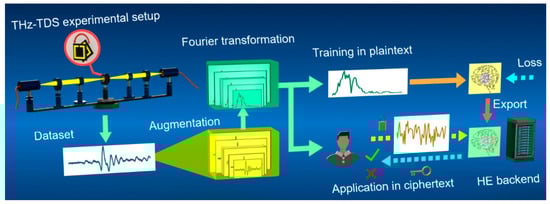 The workflow of private preserving terahertz (THz) metamaterial identification. Photocurrent signals of samples were obtained from THz measurement system and then transformed to frequency-domain. The training stage in plaintext and the application stage in ciphertext are illustrated in the upper right and lower right parts, respectively.