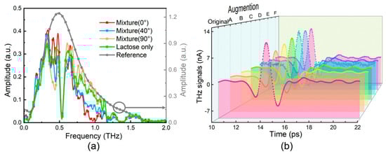 (a) Frequency-domain spectra of metamaterial-lactose mixtures with different azimuthal angles of 0°, 40°, 90°, respectively. The grey dotted line is the reference signal without any samples; (b) Data augmentation on THz temporal waveform signals. A-F represent signals with attenuation of 70%, 80%, 90%, and signals adding Gaussian noises with mean value 0 and variance 5 × 10−9, 10−9, 10−10, respectively.