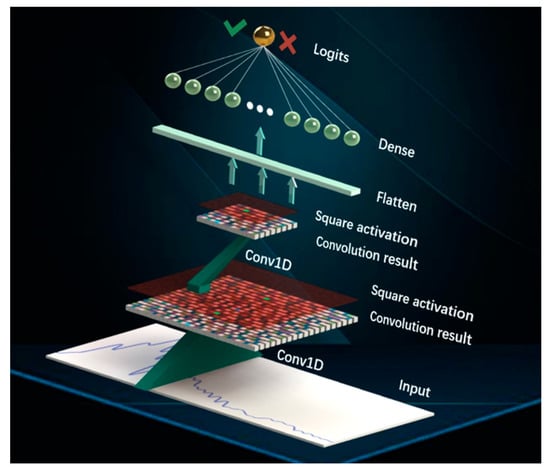 Convolutional neural network (CNN) inferences on raw frequency-domain spectrum using two convolutional layers and one fully-connected layer. “Input” layer was a vector of 61 numbers. In the first “Conv1D” operation, which was represented as a green cone, input signals were convolved by 32 kernels with shape 1 × 3. Then the 30 × 32 shaped output was obtained and represented as a black-and-white grid. Subsequently, the “Square activation” operation was added as a light red square.