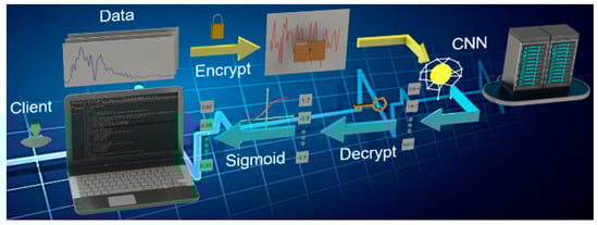 Secure application in client-server model. Possessing private data waiting for identification, client encrypted his plaintext using public key for ciphertext, which was then received by the server. Without decrypting it, the server performed calculations of CNN with homomorphic encryption (HE) backend directly and sent the decrypted results to the client, who uncovered results with his secure key.