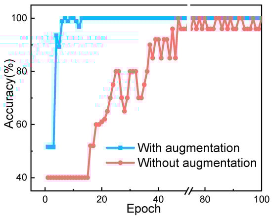 Figure 5 is the test process taking one-fold as an example, where accuracy quickly arrived at 100%, indicating the model’s robustness and ability in predicting. Compared with the red line, data augmentation also has a remarkable effect in enhancing stability.