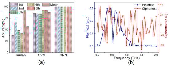 (a) Comparison of accuracy on each fold for human, support vector machine (SVM) and CNN; (b) Plaintext and ciphertext of one THz signal.