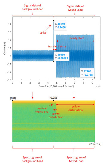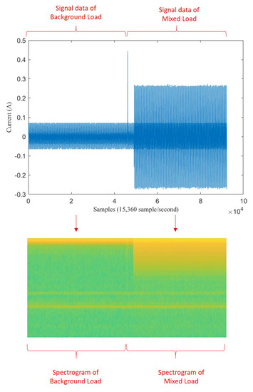 Illustration of transformation from signal to spectrogram on mixed load.