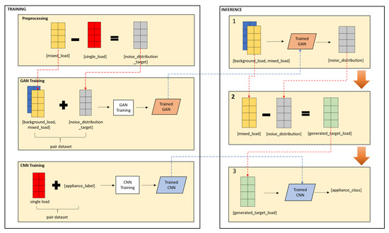 The proposed idea is illustrated in Figure 3. The proposed method comprises of two general process—training and inferences. Training process aims to build GAN model and CNN model. Inference process is where the load identification implemented. There are three main steps in inference process. Step 1: noise generator model GAN which receives background load and mixed load and output noise distribution, as described in Equation (4). Step 2: target load is calculated based on that noise distribution using Equation (5). Step 3: load identification model CNN which receives generated target load and output appliance class, as described in Equation (6).