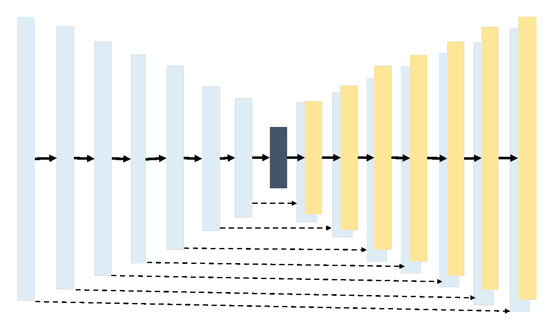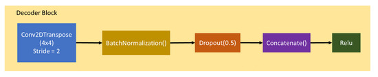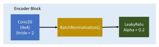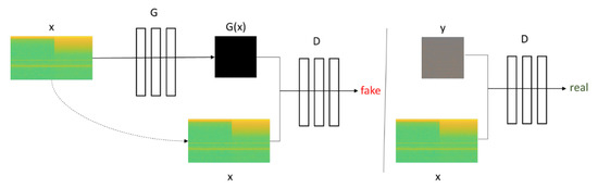 In general the objective of GAN is G tries to minimize this objective against an adversarial D that tries to maximize it, that is, . But in Pix2Pix GAN, the objective of this is a combination between the objective of conditional GAN (Equation (9)) and Loss distance (Equation (8)) as encourages less blurring [34]. It can be seen in Equation (7), where is the weight on the objective relative to the GAN objective. This combination is because of the beneficent to mix the GAN objective with a more traditional loss [35]. In this way, the Discriminator’s task remains unchanged, but the generator is tasked to not only fool the Discriminator but also to be near the ground truth output in an sense: