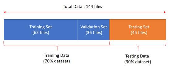 The splitting ratio of training and testing data was chosen to be 90:10 after several experiments. At first, the training of CNN was experimented using splitting scenario as Figure 10, which is 70:30 splitting ratio. Because the number of data file is really small, in practice the real training data used was only 63 files (which is only 7 files for each class), 36 files used for validation data (which is only 4 files for each class), and 45 files used for testing (which is only 5 files for each class). In ratio 70:30 splitting data, we found the imbalance problem because the training only used 63 files out of 144 files (training data fraction used was less than 50% of total data). If the number of training data is imbalance, overfitting problem can occur. On the other hand, when we used train-test splitting into 90:10, 108 files was used for training, 18 files was used for validation, and 18 files was used for testing. We found this is more balancing because the training used 108 files out of 144 files (training data fraction used was 75% of total data). Therefore, we chose 90:10 splitting scenario.