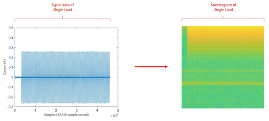 For single load data, the spectrogram image size was only 256 × 256 because only 3 s signal after the turning-on event was taken. Figure 12 illustrates before-after spectrogram transformation of single load (). This illustration also used LED lamp signal. Therefore it also has one vertical spike line in at the beginning of signal data, followed by lower current value then higher current value. Correspondingly, it also has one vertical yellow line at the beginning of spectrogram image, followed by short green pixels distribution then long yellow pixels distribution.