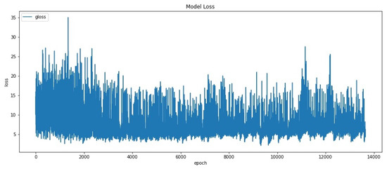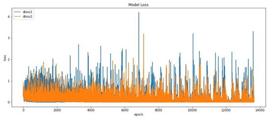 Discriminator loss was implemented using Cross-entropy (see Equation (10)). We plotted two types of Discriminator loss in order to easily compare the performance of Discriminator in discriminating real images and discriminating fake images. Variable represents Discriminator loss in discriminating real images. Variable represents Discriminator loss in discriminating fake images. Figure 14 shows the plot of and . Based on the figure, it can be seen that range values remains lower than range values at the beginning. This result shows the generator is poor at generating examples in some consistent way that makes it easy for the Discriminator to identify the fake images. But starting from iteration 9000, and are the same, which means the Discriminator is fair enough to identify real samples or fake samples (i.e., equilibrium has reached). By this way, we concluded that if the generator model is capable of generating plausible images, then the expectation is those images would have been generated after iteration 9000. Especially, the point where and are nearly the same (around iteration 12,000 to 13,000).