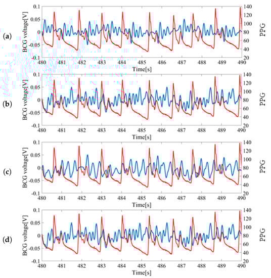 Sample data of raw sensor inputs measured from a subject lying on the back: (a) Ballistocardiogram (BCG) signal from S1 vs. photoplethysmography (PPG) signal; (b) BCG signal from S2 vs. PPG signal; (c) BCG signal from S3 vs. PPG signal; (d) BCG signal from S4 vs. PPG signal. Blue colored signals correspond with the measurement from bed leg sensors and red colored signals (finger pressure) correspond to the PPG signal from the pulse oximeter.
