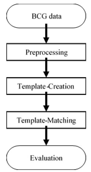 In this section, the data analysis method is described. A template-matching algorithm was utilized to find the largest peaks. This approach mainly consisted of three steps: preprocessing, template creation, and template matching. The flow chart of our heartbeat detection algorithm is shown in Figure 4 and the details and evaluation method are described below. The mathematical equations for predicting sleep stages are described afterwards.