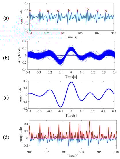 A single template was prepared from the training set using the following process. First, local peaks with at least 0.7 s intervals were extracted from the signal, as shown in Figure 5a. The minimum peak distance was 0.7 s and was chosen by means of empirical observation. We randomly selected 20 out of 39 subjects as the training group, and the remaining 19 subjects as the evaluation group. Then, we tested the minimum distances of the peaks as parameters, from 0 s to 1 s, with 0.1 s steps, and concluded that 0.7 s was the most suitable.