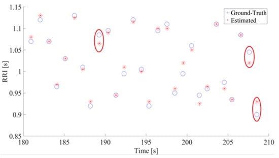 An example of estimated HRV is shown in Figure 6. This figure shows the RR intervals between estimated R peaks and their occurrences in the time domain. As seen in the figure, the errors between our estimation and the ground truth are miniscule. In this example, the highest absolute errors were 25 ms for two pairs and 20 ms for one pair. The red circles indicate pairs of ground truths and estimated RR with absolute errors of 20 ms or more. From all comparisons between estimated RRs and ground truth RRs, the maximum absolute error was 30 ms and the minimum error was 0 ms.