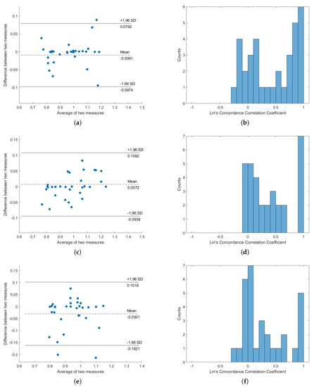 Concordance analysis result, from “Average signal of S1 and S2”. (a,c,e) are the Bland–Altman plots for subjects lying on their back, subjects lying on their left, and subjects lying on their right, respectively; (b,d,f) are the histograms of Lin’s Concordance Correlation Coefficients for subjects lying on their back, subjects lying on their left, and subjects lying on their right, respectively.