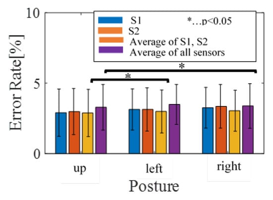 From the viewpoint of the signal used for the estimation of HRV, since no significant difference is found in the results of S1 and S2, it is considered that there is no difference in the SNR between the measurement signals of S1 and S2. The error rate of HRV, estimated from averaged signals of outputs from S1 and S2, is lower than the other cases and is the best among the other candidates. This result supports the results of our precision analysis. On the other hand, it also supports the results of the precision analysis in that the error rates increase when outputs of all sensors are averaged. From the standpoint of posture, a statistically significant increase in the error rate is observed for patients lying on their back and left side when using the average signals of S1 and S2, and for patients lying on their back and right side when using the average signals of all outputs.