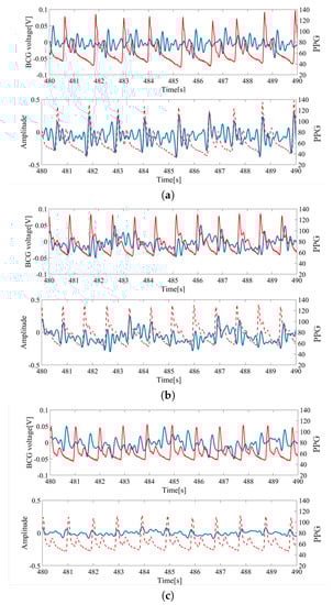 HRV extraction from the BCG; (a) sub1 (age: 30 s, height: 175 cm, weight: 59 kg, BMI 19.3). (b) sub5 (age: 20 s, height: 156 cm, weight: 52 kg, BMI 21.4). (c) sub14 (age: 30 s, height: 178 cm, weight: 90 kg, BMI 28.4). The blue line corresponds to raw data and preprocessed BCG data. The red line corresponds to finger pressure.