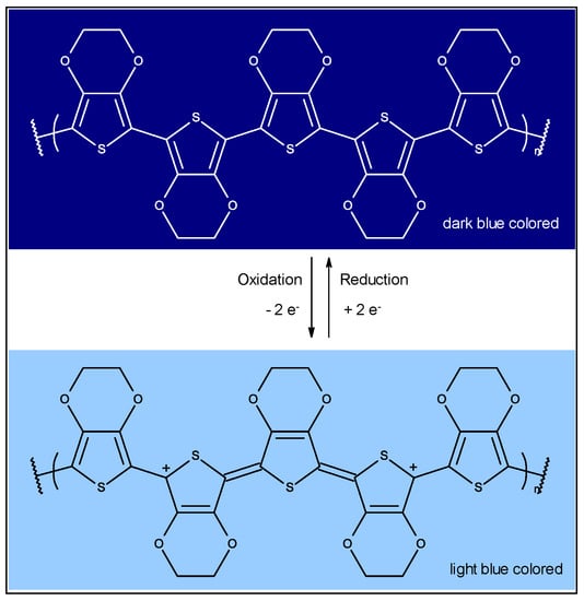Besides inorganic thin layers, organic and metal-organic compounds can also exhibit electrochromism. These compounds are, e.g., small molecules like benzothiadiazole fluorophores, bipyridylium salts (also called viologens), and electrically conductive polymers like derivatives of polyaniline (PAni) and polythiophene (PT) [15,16,17,18,19,20,21,22]. These polymers exist in a broad variety of oxidation states, which all appear in a different color, e.g. for PAni three different colored states are known: the colorless leucoemeraldine, green emeraldine and dark blue pernigraniline [18,23]. Poly-3,4-ethylenedioxythiophene polystyrene sulfonate (PEDOT:PSS) exists in two states. The oxidized cationic state it is light blue colored and semi-transparent, and when reduced to the neutral state it is dark blue (Figure 1) [24].