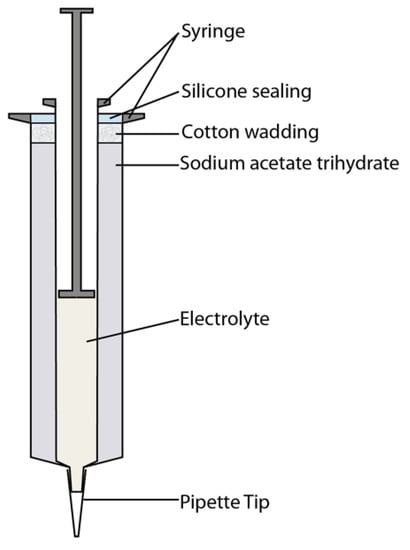 The space between the walls was filled with a supersaturated sodium acetate trihydrate solution. The exothermic crystallization of sodium acetate trihydrate solution provides enough heat to ensure, that the electrolyte remains liquid during the application [42]. Since the crystallization is a reversible reaction, the applicator is reusable after reliquification of the sodium acetate trihydrate. The substrates were laminated together using a colorless Toolcraft spray adhesive from Conrad Electronic SE (Hirschau, Germany).