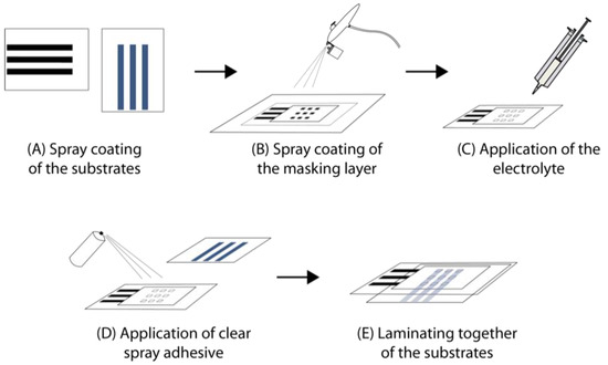 The textile substrates were kindly provided by Schmitz-Werke, Emsdetten, Germany. The coatings were performed on a polyester (PES) plain weave fabric (200 g/m²) and a semi-transparent polyester rip-stop fabric (120 g/m²). Further, the fabrics were pre-coated with the polyurethane dispersion Tubicoat MEA (CHT R. Beitlich, Tübingen, Germany) to avoid bleeding blurs of the coated and sprayed electrode layers using a 40-µm roller bar. Polyethylene terephthalate (PET) film with a thickness of 25 µm was provided by Inoviscoat GmbH, Monheim am Rhein, Germany. A transparent polyethylene polyester membrane (PEPES) was provided by Sympatex, Unterföhring, Germany. Roller bar coatings were performed with a 40 µm gap size bar. Spray coating was performed with a Revell airbrush pistol. Electrolyte E1 was applied with a pipette whereas the electrolyte E2 was applied with a heated, double-walled syringe (see Figure 4).
