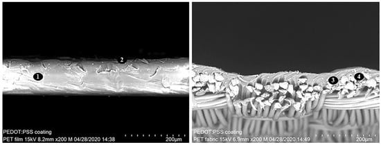 SEM crosscut micrographs of PEDOT:PSS (2) roller-bar coated PET film (1) (left) and PET fabric (right). The coated film is flat, whereas the fabric is coated unevenly with thick (3) and thin spots (4) on the surface.
