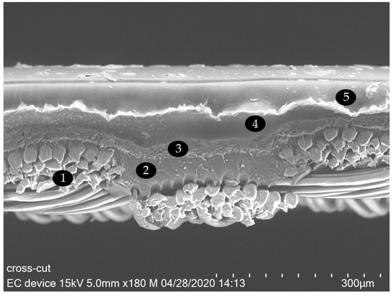 SEM crosscut micrograph of an electrochromic device with 1—PES fabric, 2—polyurethane pre-coating, 3—counter electrode, 4—electrolyte with titanium dioxide, 5—top substrate with PEDOT:PSS layer.