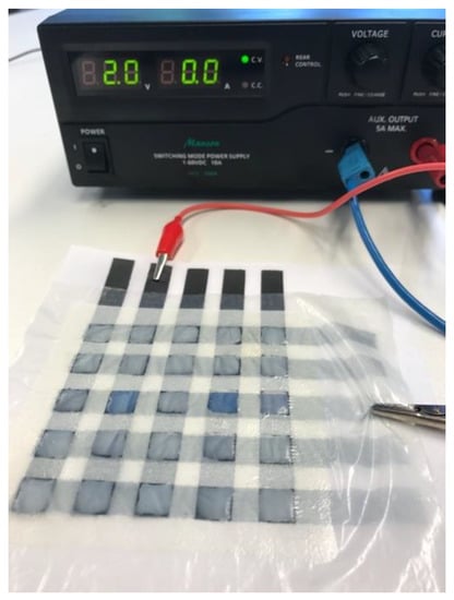 The cells are flexible and bendable. Further, the textile-based devices could also be creased to some extent. The switching time directly after assembling was 2 s at a voltage of 2.0 V. Moreover, the switching time and voltage remained constant after 25 cycles. Crumpled and re-flattened devices were still working, while the switching time and voltage did not change. The electrolyte was quite stable and held back moisture over an extended period of time. Even after one year, the cell could still be switched on and off. After one year, the switching time increased and was found to be at around 4 s at 2.0 V. A 5 × 5 electrochromic matrix with this configuration is shown in Figure 8.