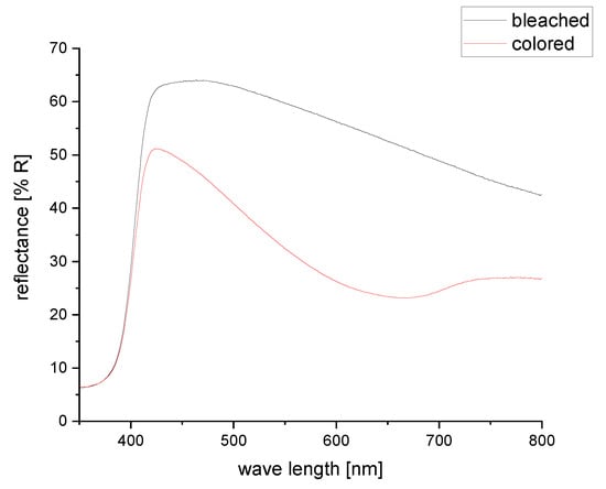Coloration efficiency is an important characteristic for electrochromic devices. It is calculated using the transmittance of bleached and colored state. However, in this case no transmittance in the visible range can be measured due to the high reflection and light scattering on titanium dioxide particles in the electrolyte and the high absorption of light on the black counter electrode. Therefore, reflectance spectra of bleached and colored states were measured in the visible light range between 350 and 800 nm (Figure 9).