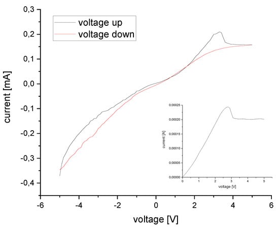 Voltage-current data for one cycle from −5 to +5 V and from 0 to +5 V (inlay).