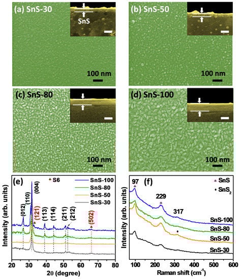 (a–d) SEM surface images of different as-deposited SnS thin films. The insets show cross-sectional SEM images with the corresponding thicknesses (the scale bar represents 100 nm). (e) X-ray diffraction spectra and (f) Raman spectra of as-deposited SnS thin films.