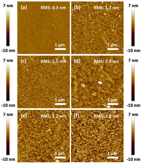 (a–d) AFM surface images of different as-deposited SnS thin films. (a) SnS-30, (b) SnS-50, (c) SnS-80, and (d) SnS-100. (e,f) AFM surface images of (e) SnS-80-H250 and (f) SnS-80-H300.
