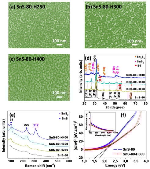 (a–c) SEM surface images of SnS-80 thin films annealed at different temperatures (250–400 °C): (a) 250 °C (SnS-80-H250), (b) 300 °C (SnS-80-H300), and (c) 400 °C (SnS-80-H400). (d) Corresponding XRD and (e) Raman spectra of SnS-80 thin films annealed at different temperatures (250–400 °C) and that of the as-deposited SnS-80 thin film. (f) Tauc plots for the as-deposited SnS-80 and SnS-80-H300 thin films. The inset shows the corresponding absorbance curves.