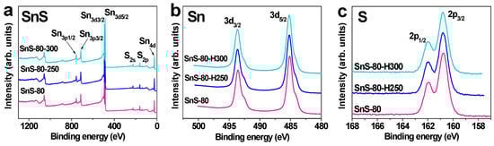 Survey (a) and high-resolution ((b) Sn 3d and (c) S 2p) XPS profiles of SnS-80, SnS-80-H250, and SnS-80-H300.
