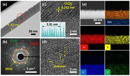 (a) TEM image of a SnS-80-H300 thin film on a glass substrate. (b) SAED trace of the selected region in (a) demonstrating the polycrystalline structure of the thin film. High-resolution TEM images of different regions (c) without and (d) with pinholes. The inset in (c) shows the distance between (113) lattice plane fringes. (e) Elemental mapping results for a SnS-80-H300 thin film on a glass substrate.