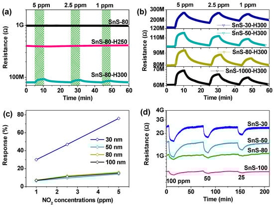 A comparison of SnS-80, SnS-80-H250, and SnS-80-H300 thin-film sensors was conducted at different NO2 concentrations under UV illumination at RT, as shown in Figure 7a. It should be noted that the base resistance of the SnS-80 thin film was very high (~1 GΩ), indicating its low hole concentration and/or mobility (Table 2). Meanwhile, Hall effect measurements revealed an interesting observation. While SnS-80 and SnS-80-H300 exhibited clear p and n conduction types, respectively, SnS-80-H250 showed an unclear conduction type, fluctuating between n- and p-types. This may indicate a highly compensated doping state in SnS-80-H250, or the coexistence of electron and hole carriers in the material. The high resistance of SnS-80 might be derived from a relatively poor crystalline nature with inactivated dopants in the as-deposited thin film. The decreasing resistance with heat treatment (~400 MΩ for 250 °C and ~80 MΩ for 300 °C) can be explained by enhancement in the dopants activation and crystallinity. However, the conductance of SnS-80-H300 was motivated through the conduction type change from p-type to n-type due to S deficiency, as confirmed in Table 1 and Table 2.