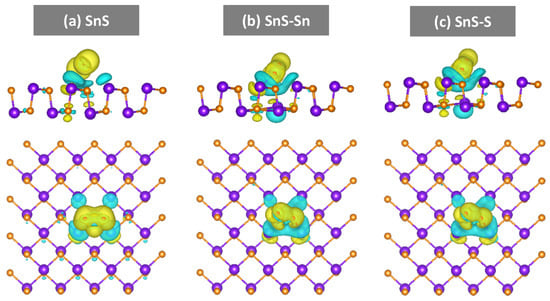 Side-view (top) and top-view (bottom) images showing the charge density difference of NO2 molecules adsorbed on various SnS monolayer structures: (a) SnS, (b) SnS-Sn, and (c) SnS-S. The yellow and cyan regions represent the areas of electron accumulation and depletion, respectively.