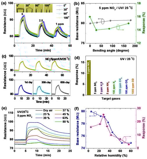 The effect of relative humidity (RH) on the response of the SnS-80-H300 sensor at RT was also examined, as summarized in Figure 9e,f. The base resistance of the sensor was reduced continuously owing to the electron donation by water molecules into the SnS film. This trend is similar to our previous observations [,]. It should be noted that the response of the SnS film exhibited a decrease onset at 30% RH. However, in the previous study, the In2O3/Rb2CO3 sensor showed a decrease onset at approximately 45% RH. These results indicate that a film with low porosity would exhibit a decrease in response quickly under exposure to RH. The presence of RH decreases the depletion layer width, which is the main reason for the significant modulation of the sensor response by the nano-size effect. Therefore, the optimal response was observed at ~30% RH. Meanwhile, the significantly lower response at high RH, especially that at 80% RH, can be explained by the formation of a water molecule layer on the SnS film surface, hindering the adsorption of NO2. Generally, the n-type SnS thin-film sensor exhibited good sensing performance against bending, high adhesion, and a thermal expansion coefficient that is compatible with that of a PI substrate. Therefore, our study paves the way to develop RT flexible sensors with enhanced gas-sensing performance and good bending ability.