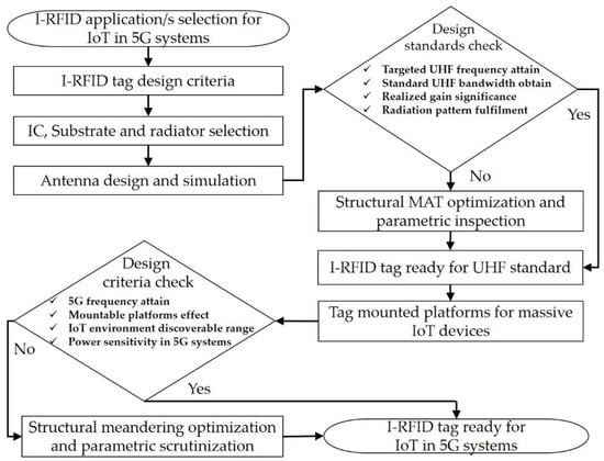 Flow chart of design process for I-RFID UHF tags for 5G IoT systems.