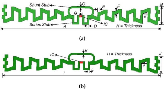 The design procedure of the proposed I-RFID tag is demonstrated in Figure 3. MAT antennas are fabricated on Korsnäs substrate (375 µm) by flexo printing, with constraints of permittivity (εr) = 3.3 and electrical tangent loss (δ) = 0.077 (at 25 °C). Asahi paste (LS-411AW) was used as an antenna radiator with a thickness of 15 µm. The tags were constructed using screen- and flexo-printing machineries. Its bulk conductivity (σ) 2–3 × 106 S/m and its average conductivity value 2.5 × 106 S/m were utilized in tag design. In this way, the total thickness of the designed tag was 390 µm (0.39 mm). Little power (−15 dBm) is needed to function the flip-chip (NXP-G2XM) []—at 915 MHz, its impedance is 22 − j195 Ω, and its geometric size is 3 mm × 3 mm, which was selected as the integrated circuit (IC) due to its passive UHF RFID MAT tag composition. The projected UHF I-RFID MAT tags are illustrated in Figure 4a for the European (EU) tag standard and Figure 4b for the North American (NA) tag standard, correspondingly.