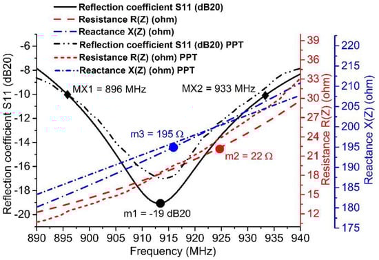 Reflection coefficient measured under −10 dB: m1 is the minimum reflection coefficient S11 at fc = 913 MHz (which is −19 dB), m2 is the resistance (which is 22 Ω), and m3 is the reactance (which is 195 Ω). These markers (m1, m2, m3) exist within the target bandwidth (37 MHz) from MX1 = 896 MHz to MX2 = 933 MHz at S11 = −10 dB and conjugate impedance (22 + j195 Ω) of the North American UHF RFID band. The tag antenna is achieved w.r.t. the targeted IC impedance (22 − j195 Ω) for the proposed tag and previously published tags (PPT).