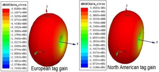 Torus-shaped omnidirectional radiating pattern of antenna gain: for European tag, 0.6 dB (2.75 dBi); for North American tag, 0.98 dB (3.14 dBi).