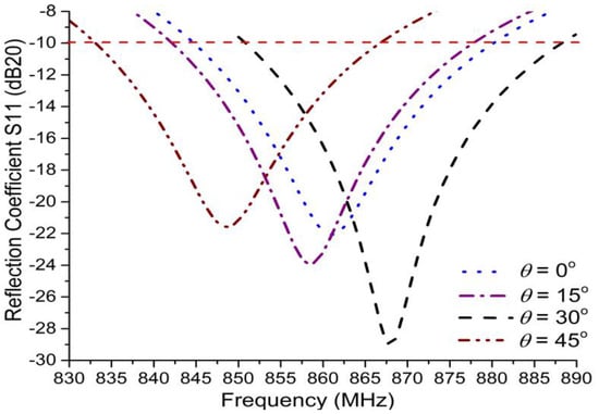 Considering MAT, Table 2 illustrates the behavior of the proposed I-RFID tag antenna, with respect to the S11 curve, circuit gain, and size reduction. At a plane angle (θ = 0°), the antenna size was 10.12 cm × 1.22 cm, the minimum reflection coefficient was −22 dB, and the radiated gain was 2.38 dBi. With an elevation angle variation of θ = 0°, 15°, 30°, and 45°, the results were adjusted, as depicted in Table 2 and Figure 8. At the angle θ = 30°, the tag antenna size was minimized, with lower S11 than with lower angles ones, which led to 10.12 cm × 1.05 cm size and −29 dB S11. The tag antenna gain was 2.75 dBi at θ = 30°. Accordingly, the tag is distinguishable at an extreme RR of the relating interrogator/reader, where it has lower power and secures the greatest conceivable bandwidth (37 MHz) at θ = 30°. This implies that the MAT affects not only the reflection coefficient (S11) and bandwidth (BW) but also the size and gain of the antenna. The size of the EU tag antenna previously proposed in [] was 98 mm × 15 mm, while the proposed EU tag had an antenna size of 101.2 mm × 10.5 mm, which was 38.3% smaller in size. The previous NA tag antenna size was 97 mm × 13 mm [], while the proposed NA tag antenna size was 92.4 mm × 10 mm, which was 36.5% smaller in size.