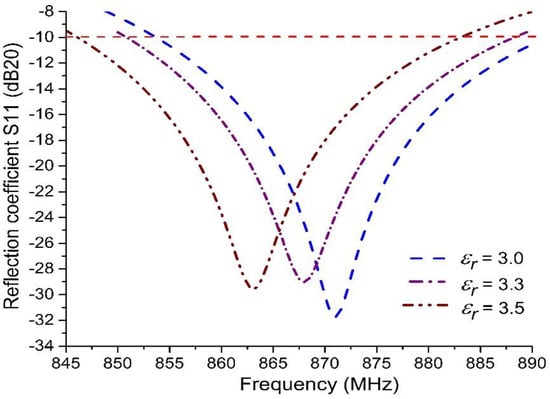 When the humidity level changes with the variation of environmental temperature, the dielectric (εr) of the substrate (Paper Korsnäs) will be affected. Figure 9 shows that when the substrate dielectric becomes εr = 3.0, the reflection coefficient curve will be shifted 5 MHz to a higher frequency; furthermore, it will shift 5 MHz to a lower frequency from the targeted center frequency (fc) when the substrate dielectric becomes εr = 3.5. In the above scenario, the proposed MAT tag holds its characteristics for the EU UHF band standard with humidity level inflation over the dielectric (εr) from 3.0 to 3.5. Similarly, the MAT tag will also bear all environmental circumstances for the NA UHF standard. Hence, the substrate materials are not influenced by the general results of proposed tag antenna whose permittivity (εr) ranges from 3.0 to 3.5. It implies that such tag substrate materials can be utilized well, and its performance should not be affected during summer and winter spells. In other words, it is reliable throughout the year.
