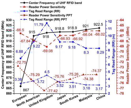 where PR is the reader power sensitivity and σ is the radar cross-section, which is 0.001 m2. Then, by utilizing Equation (7), we calculated the PR = −72.75 dBm for the European (EU) band and PR = −75.29 dBm for the North American (NA) band. The PR value for each UHF RFID band country is likewise categorized in Figure 10 for the previously published tags (PPTs) and proposed tags (PT), separately. The reader power sensitivity (PR) ranged from −69.08 dBm to −66.5 dBm for the PPTs and from −77.42 dBm to −72.75 dBm for the PTs. Put simply, we can say that a reader would require 1.58 × 10−4 mW power to communicate with the PPTs; meanwhile, for the detection of PTs, they need a minimum 3.16 × 10−5 mW of power. Through comparison of these two scenarios, the PTs performed better than the PPTs. In the smart IoT environment, all proposed tags have a radar coverage area (RR) of 6.88 m and 9.22 m for EU and NA bands, respectively. Consequently, the reader sensitivity should be less than the PR value, in order to receive data from the tag at its corresponding RR (dmax,read). This implies that MAT plays a massive role in all basic project prerequisite characteristics of the tag.