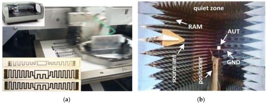 (a) Inkjet printing setup and paper substrate printed antennas; (b) Experimental setup in an anechoic chamber [].