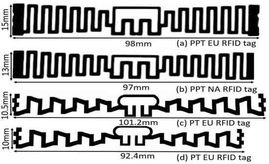 Prototypes of the antennas of previously published tags (PPT) and proposed tags (PT): (a) PPT EU UHF RFID tag (98 × 15 × 0.39 mm3); (b) PPT NA UHF RFID tag (97 x 13 × 0.39 mm3); (c) PT EU UHF RFID tag (101.2 × 10.5 × 0.39 mm3); and (d) PT EU UHF RFID tag (92.4 × 10 × 0.39 mm3).